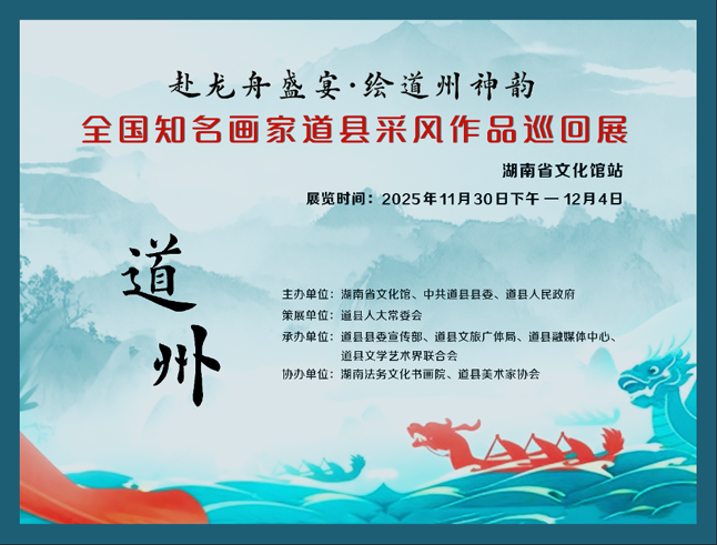 今天是11月30日,下午三点,冬日小阳春,湖南省文化馆东门一楼大厅鼓乐齐鸣、号子震天,“赴龙舟盛会·绘道州神韵”全国知名画家道县采风作品巡回展在此盛大开幕。这场活动是湖南省文化馆、中共道县县委、道县人民政府主办,湖南法务文化书画院、道县美术界协会承办。馆内大展厅内的80幅优秀的艺术作品,凝聚全国60余位知名画家心血的写生力作联袂亮相,与非遗龙舟实物交相辉映,构成一条“可行走、可沉浸”的潇水画卷。