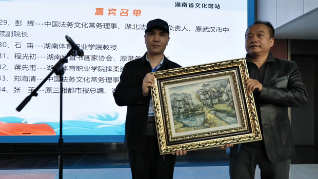 锣鼓声中,策展人鲍卫兵教授向湖南省文化馆捐赠个人油画《道州状元府的记忆》,湖南省文化馆副馆长曹隽平代表馆方接收并颁发收藏证书。湖南工商大学设计艺术学院党委书记唐朝晖教授作为艺术家代表,他说:“画笔是文化的龙舟,每一划都将驶向未来。”