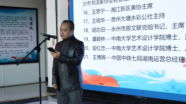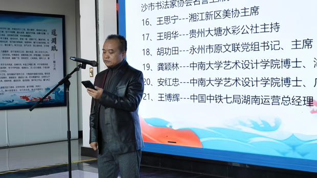 开幕式上,道县县委宣传部部长唐华豪发表热情洋溢的致辞。他指出,道县古称道州,是中华德文化摇篮、世界稻作农业源头、理学鼻祖周敦颐故里,“吾道南来”文脉厚重,龙舟竞渡激情澎湃,濂溪清风廉洁基因源远流长,“当千年古城遇上丹青妙笔,当龙舟鼓点碰撞翰墨华章,便催生了这场跨越山川、联通南北的艺术盛宴”。